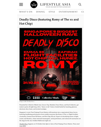 Set to be Singapore’s largest Halloween party, the city’s creative powerhouses, Collective Minds, Groove Top, Manifest, Fomo Homo, and Soul Collective — unite to present Deadly Disco, a night of haunting glamour, electronic-disco beats, and twisted nostalgia. For one night only, on Friday 31 October 2025 from 8PM till late, the iconic Pasir Panjang Power Station will be transformed by electrifying music, immersive performances, and supernatural theatrics, as local collectives join forces with world-renowned international headliners — Romy from The xx (London), Flight Facilities (Australia), Hunee (Germany), and Hot Chip (DJ) (London). The result is a full-throttle, multisensory experience that will turn Singapore into a spellbinding dance haven.